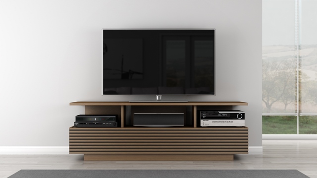 Furnitech 70 in. Samba TV Stand - SAMBA is a synthesis of exemplary design talent unsurpassed quality function and a firm commitment to sustainability. A wide range of materials and technology have brought together the finest collection of entertainment TV consoles anywhere. The Signature Home 70 in. Samba TV Stand - SAMBA features a rich warm cherry finish on Brazilian cherry veneers. Stunning "Ripped design" detail surrounds the front and sides of this functional low profile cabinet. .