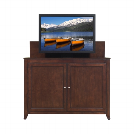 This heirloom-quality cabinet with quiet smooth electro-mechanical lift accommodates plasma and LCD TVs up to 55 wide by 32.5 tall. It features solid birch with espresso veneers with inset wood panels. The Monterey comes IR Ready to allow access to components behind the wooden doors.