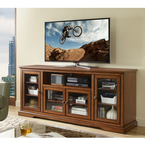 Display your entertaining space in style with this highboy media stand. Its four storage cabinets provide ample storage space to house your favorite movies components and game consoles. Features adjustable shelving behind glass-paned doors and a built in cable management system. Crafted from high-grade mdf this stand will accommodate most flat-panel tvs up to 70 in.